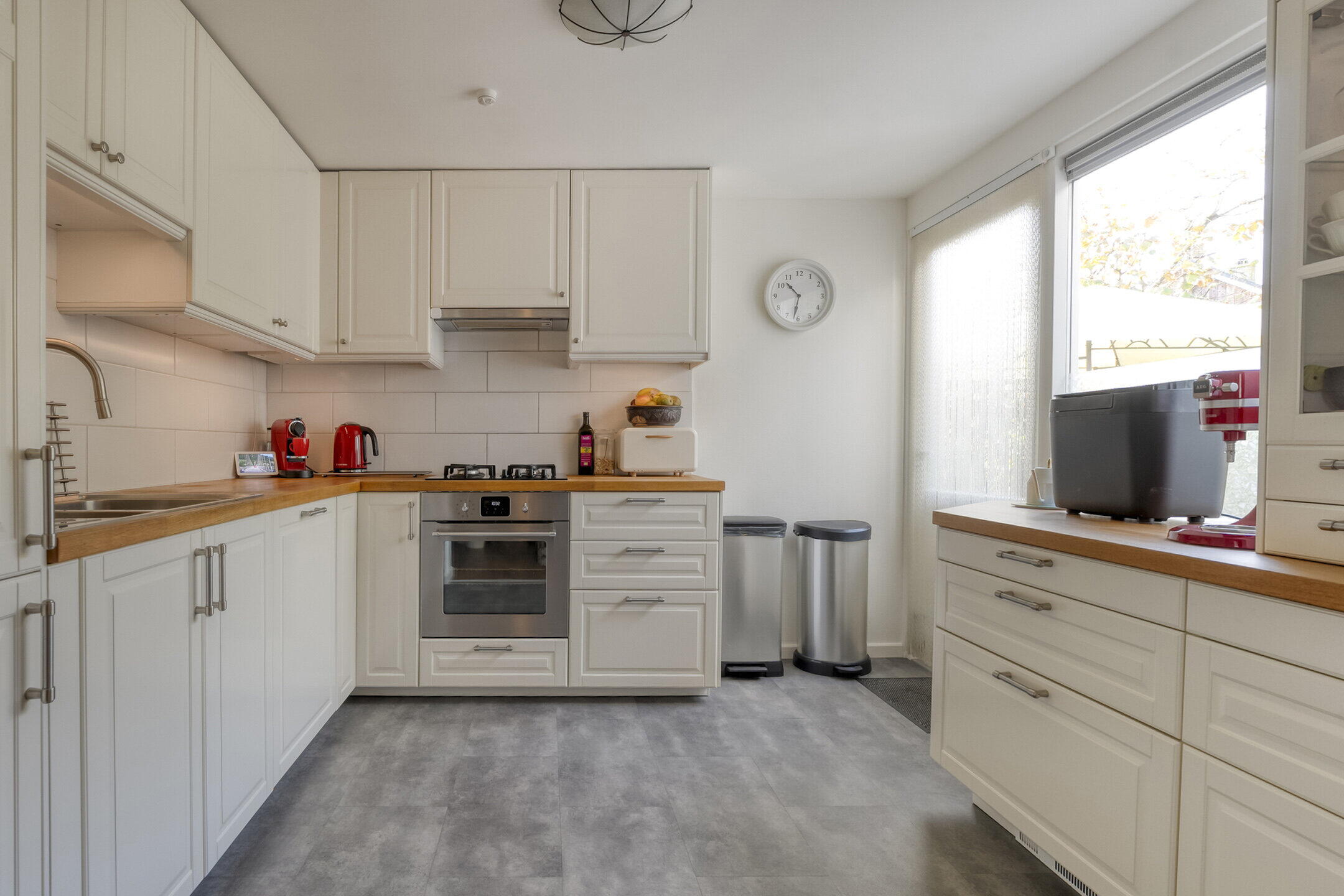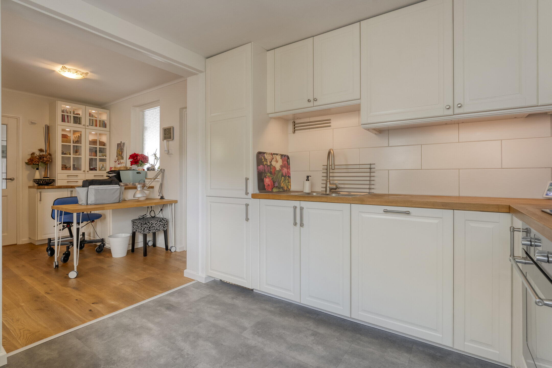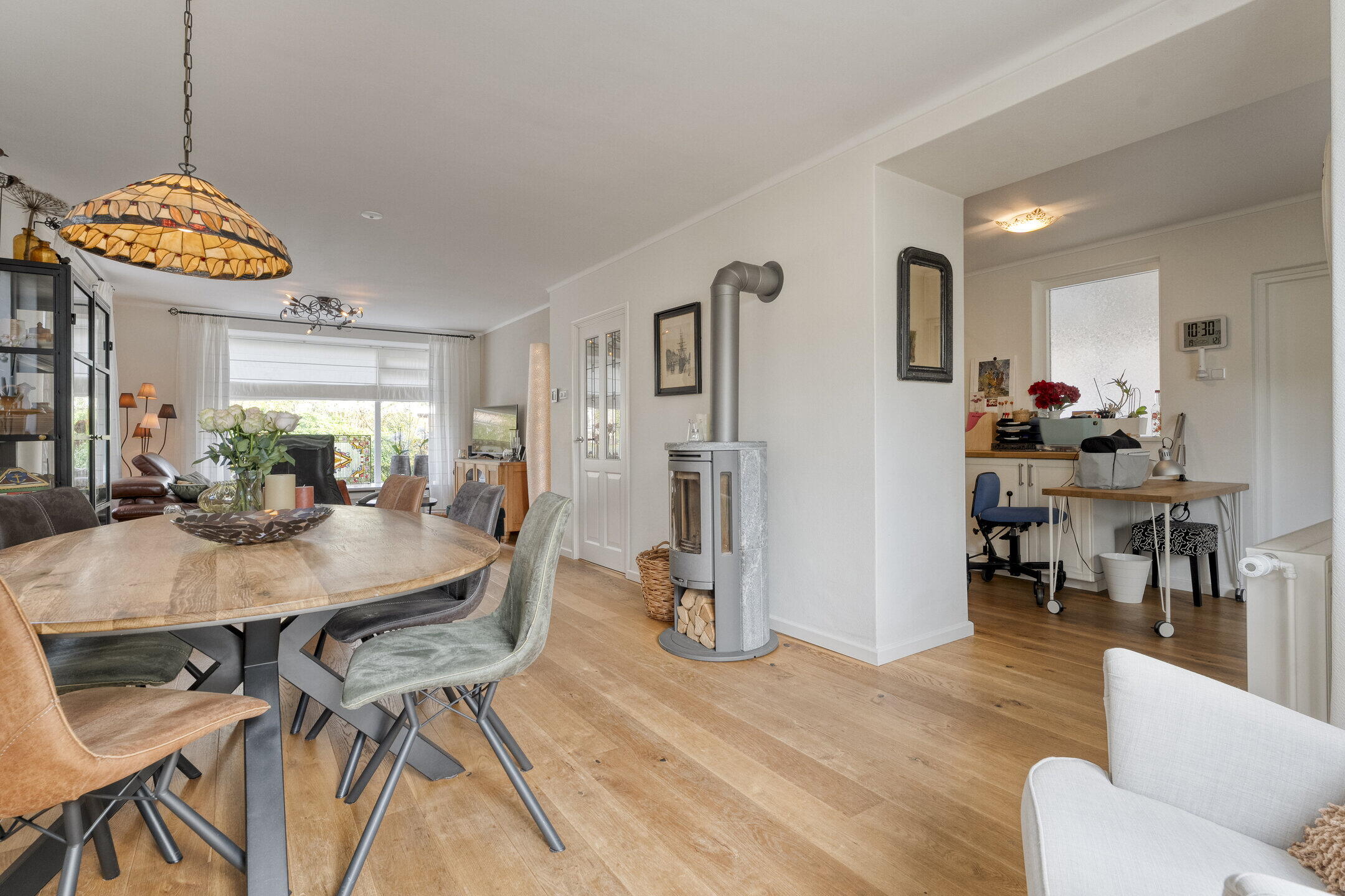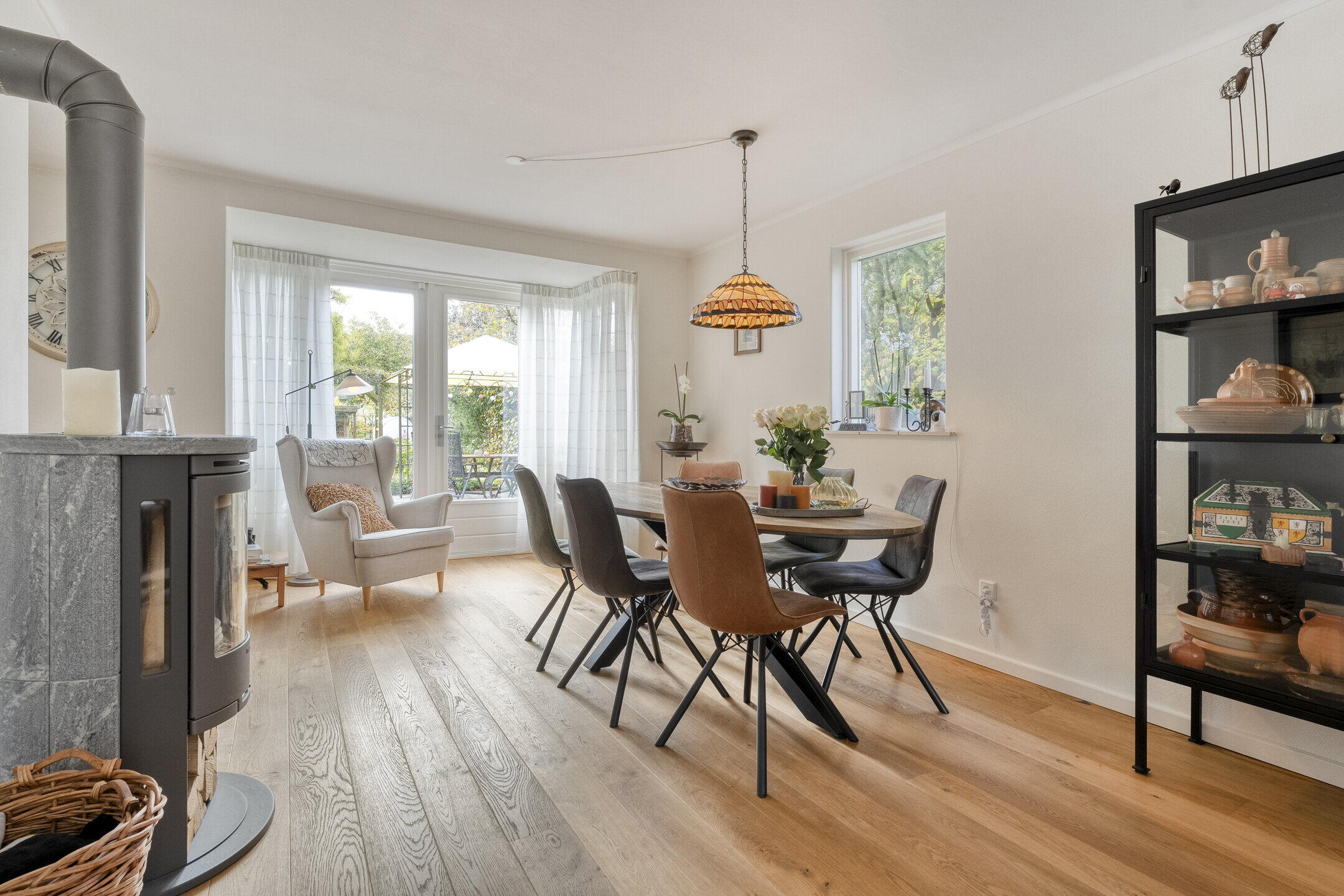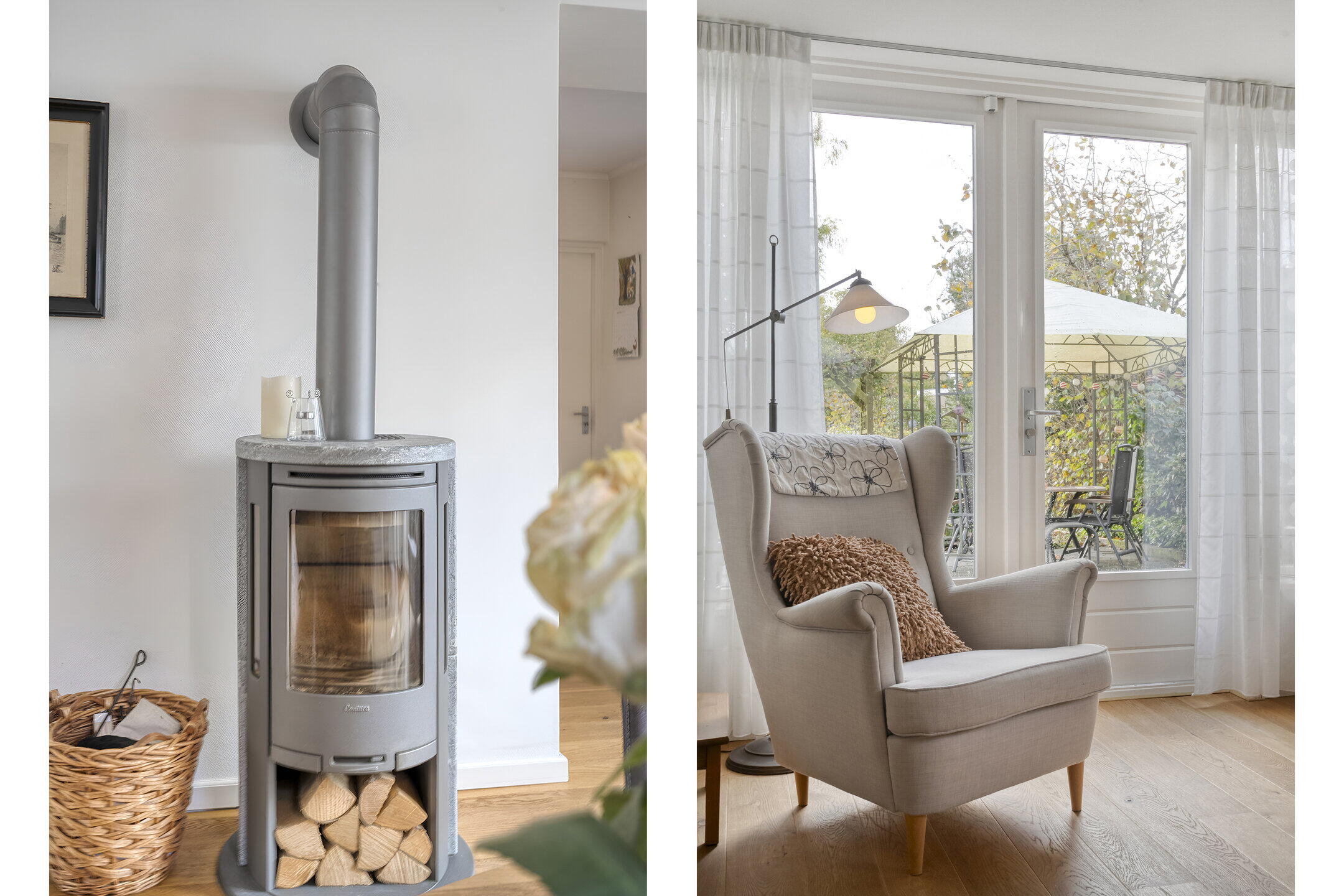Entrance with wardrobe cabinet, staircase hallway, meter cupboard and toilet room with wall closet and fountain. Spacious living room with beautiful oak floor, wood stove and bay window leading to the deep back garden and terrace. Intermediate room with internal door to attached garage, currently used as a hobby room but also suitable for dining corner or work area. Semi-open kitchen in corner layout equipped with dishwasher, refrigerator and freezer, oven and 4-burner gas hob. The rear terrace can be accessed from the kitchen.